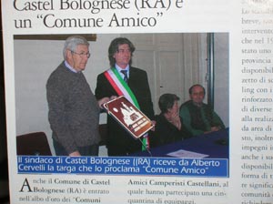La cerimonia di consegna nelle mani del Sindaco della targa da affiggere all’ingresso del territorio comunale è avvenuta in occasione di un raduno organizzato dal Club Amici Camperisti Castellani di Castelbolognese (RA), presieduto dall’infaticabile Alberto Cervelli, strenuo sostenitore dell’iniziativa. Era presente, in rappresentanza dell’Unione Club Amici, l’Associazione promotrice del progetto “Comuni amici”, Pasquale Cammarota, coordinatore d’area.